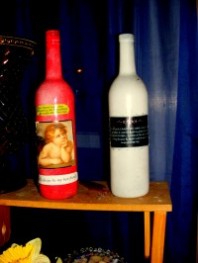 I love to make these for friends and family.All you do is get a bottle(vodka & Wine work best) paint it,let ir dry COMPLETLY,I use body tattoo's,stickers,pictures from cards,photographs,etc,hot glue them on the front,spray 1-2 coats polyurathan,and waala-a vase.